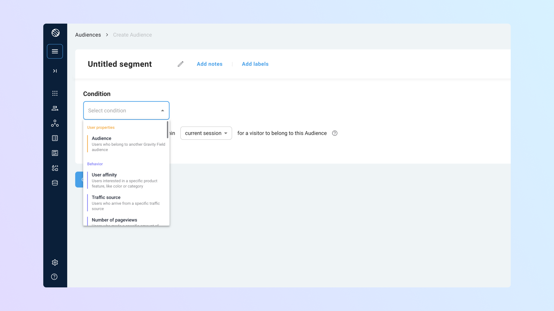 При создании аудитории вы можете использовать одно или несколько условий. Gravity Field позволяет настраивать логику объединения на двух уровнях: