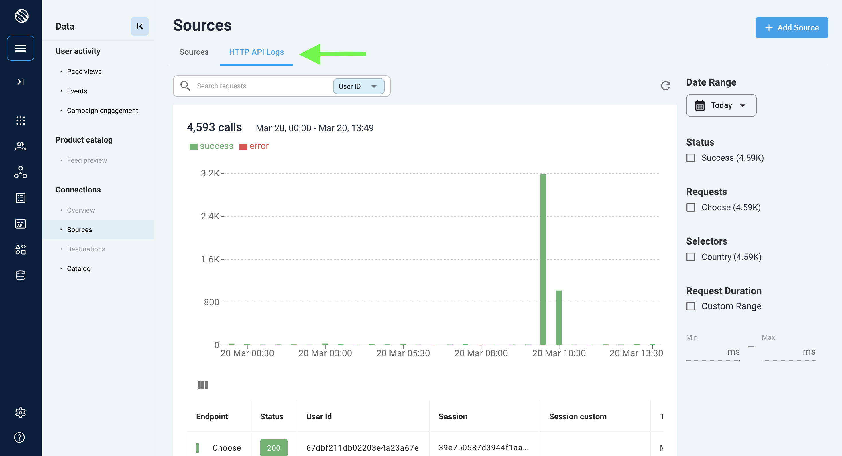 Чтобы увидеть API-логи, необходимо перейти в Data → Sources → HTTP API Logs
