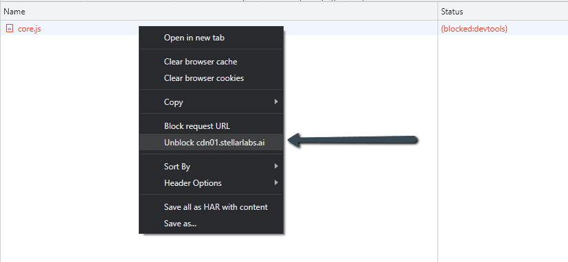 Чтобы включить скрипт обратно, вам необходимо найти core.js, который будет выделен красным (заблокирован) и после нажатия правой кнопки мыши выбрать пункт "unblock cdn-01.gravityfield.ai" (в старой интеграции "unblock cdn01.stellarlabs.ai")