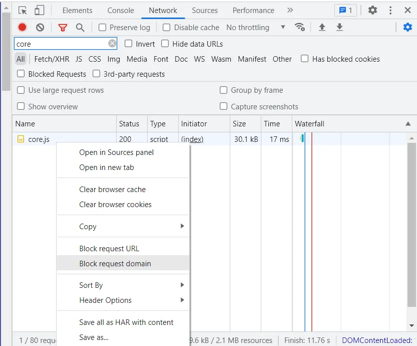 - Нажать правой кнопкой на показанный запрос и заблокировать домен (если скрипты грузятся без кастомного CDN, если с ним - то блокировать конкретный URL)