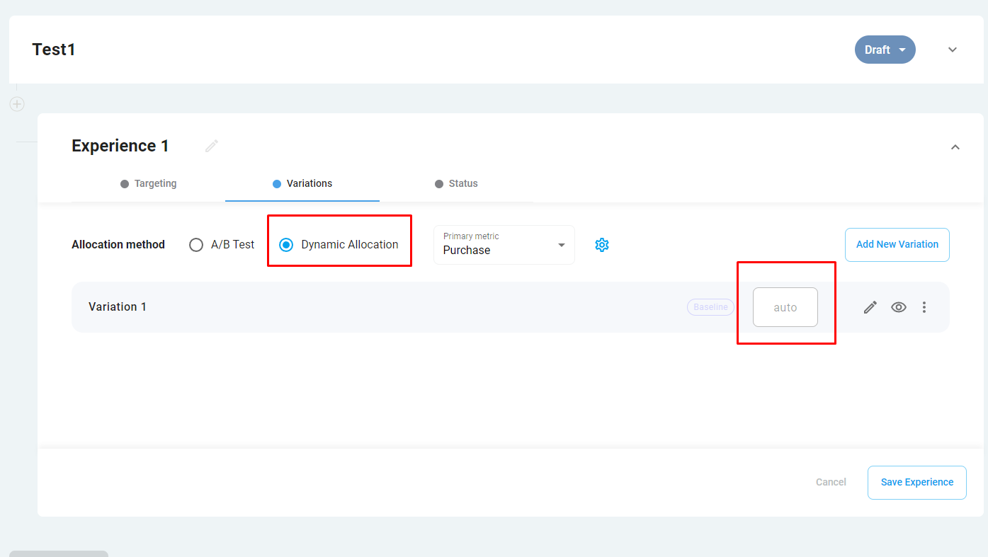 Для создания экспириенса с динамической аллокацией, необходимо перейти на страницу создания/редактирования компании, и выбрать динамическую аллокацию в качестве метода. После этого вы увидите, что процентное значение распределения трафика изменится на “auto”.