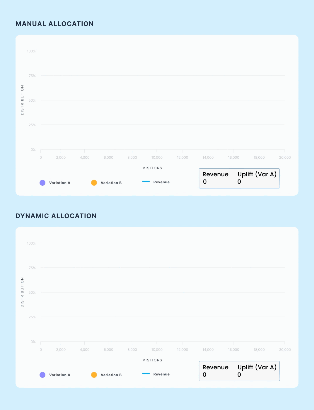 В отличии от классического A/B теста, Dynamic Allocation не будет дожидаться статистически значимых результатов и увеличит трафик вариации, как только вариация покажет хороший результат на небольшом проценте трафика.