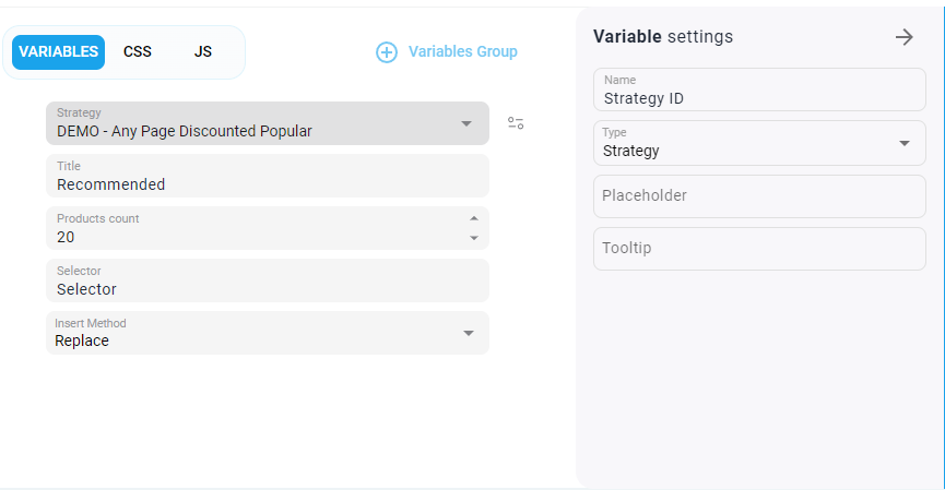 После того, как в код добавлены переменные, они также появятся во вкладке Variables редактора кампаний.
