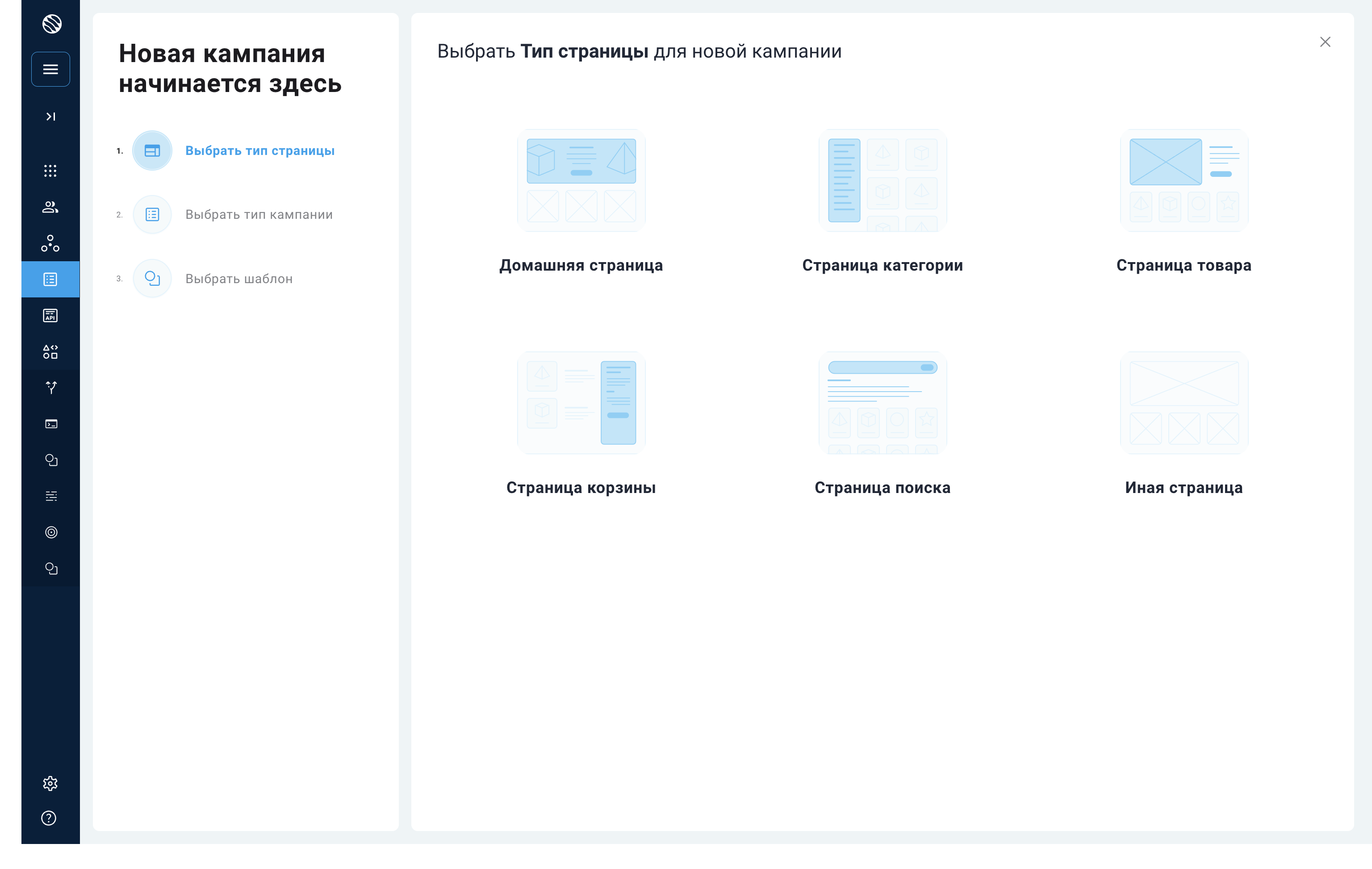 - Выберите тип страницы, где будет показываться кампания (например, главная страница, карточка товара и т.д.).