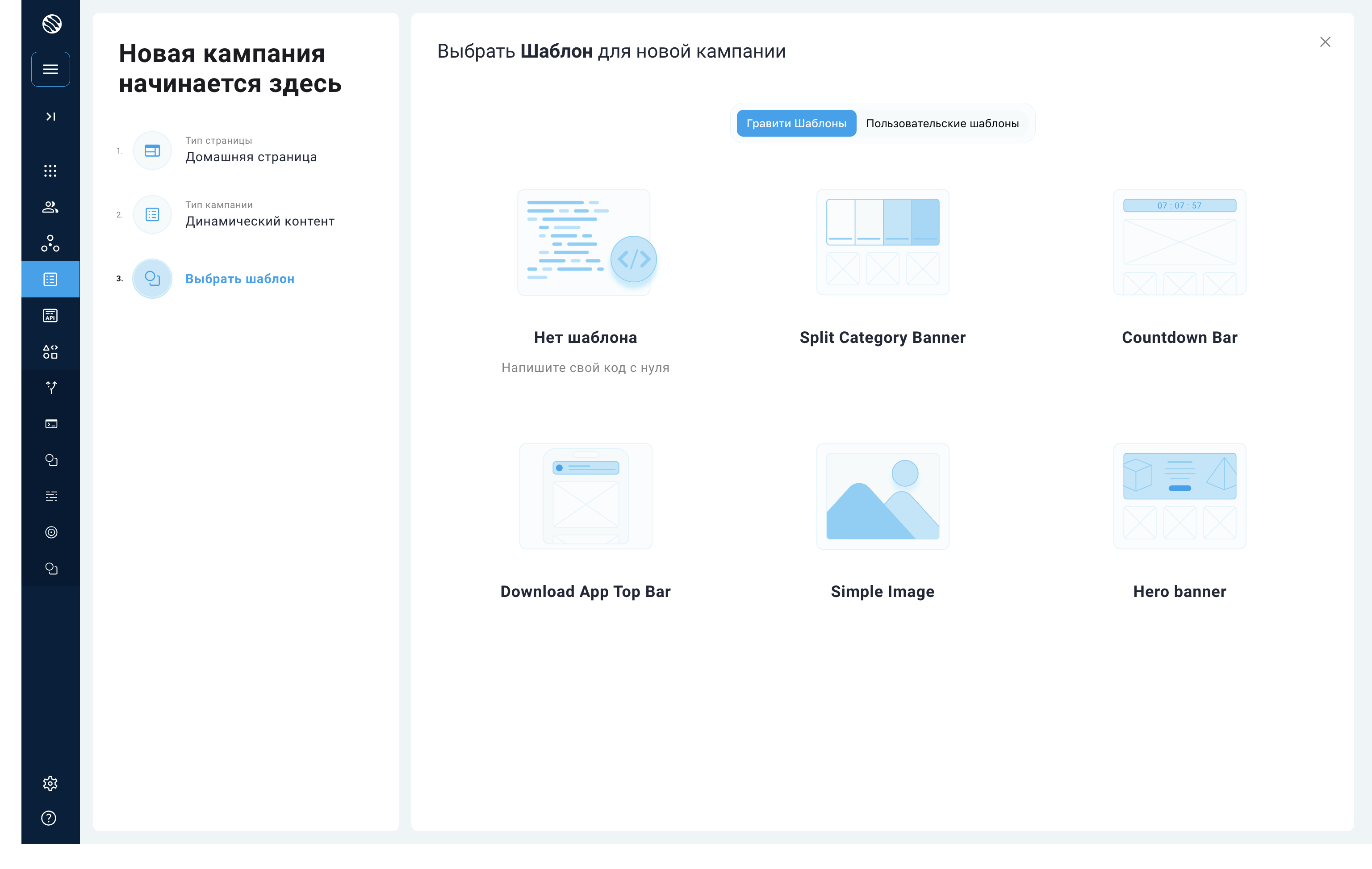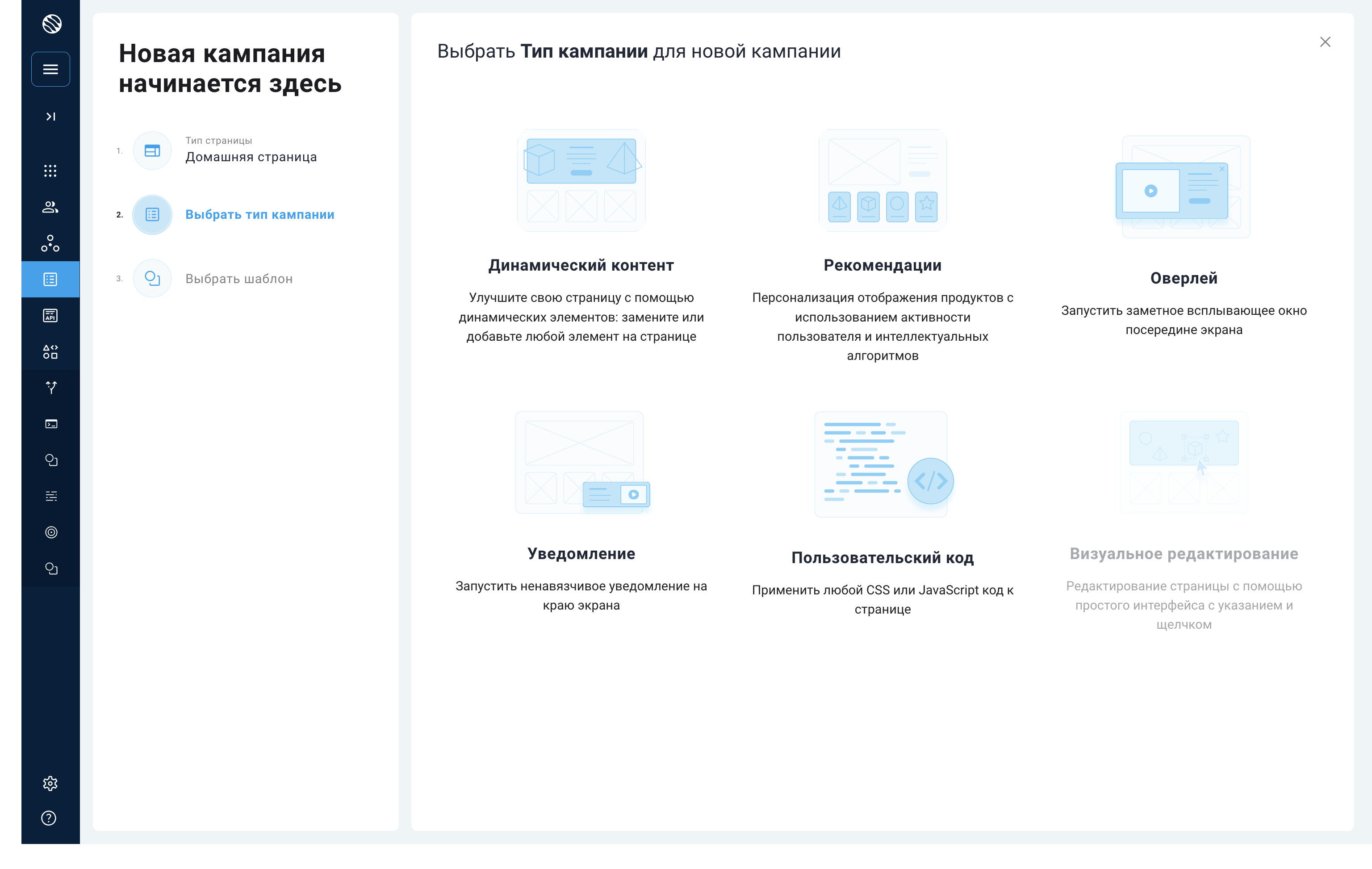- Выберите нужный тип кампании (например: рекомендации, уведомления, оверлей, динамический контент или кастом код). Подробнее о типах кампании