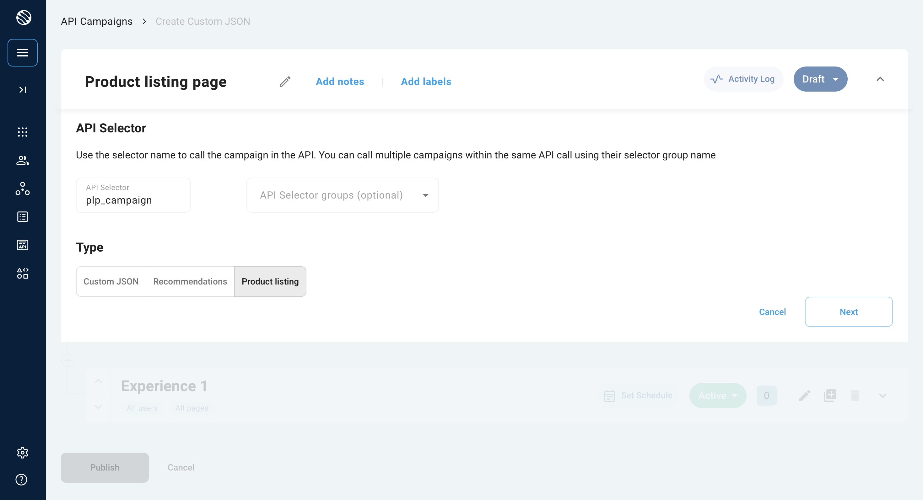 Внутри кампании создайте несколько сценариев (experience) и настройте для каждого таргетинг и свою PLP-стратегию.