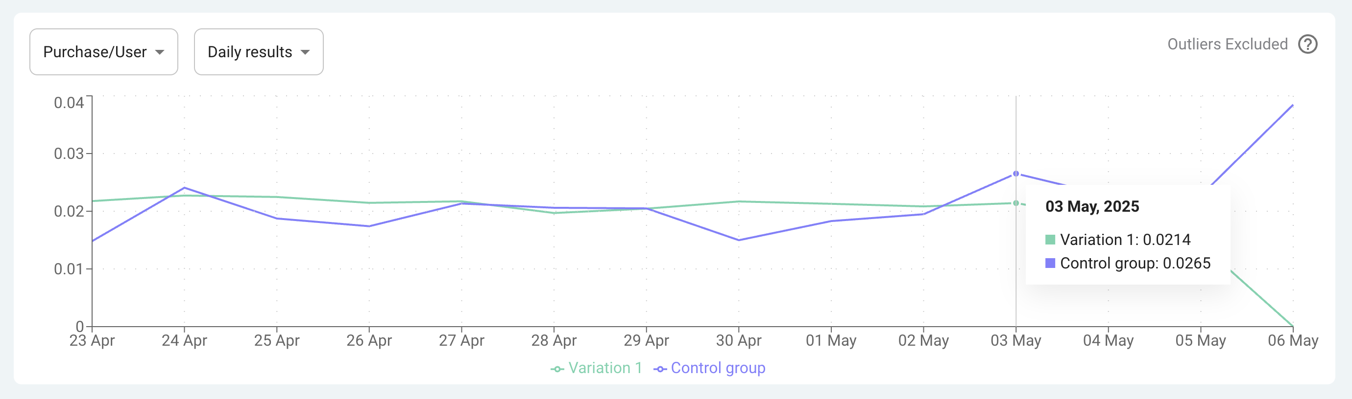 - Основная метрика (например, Revenue/User, Purchases)