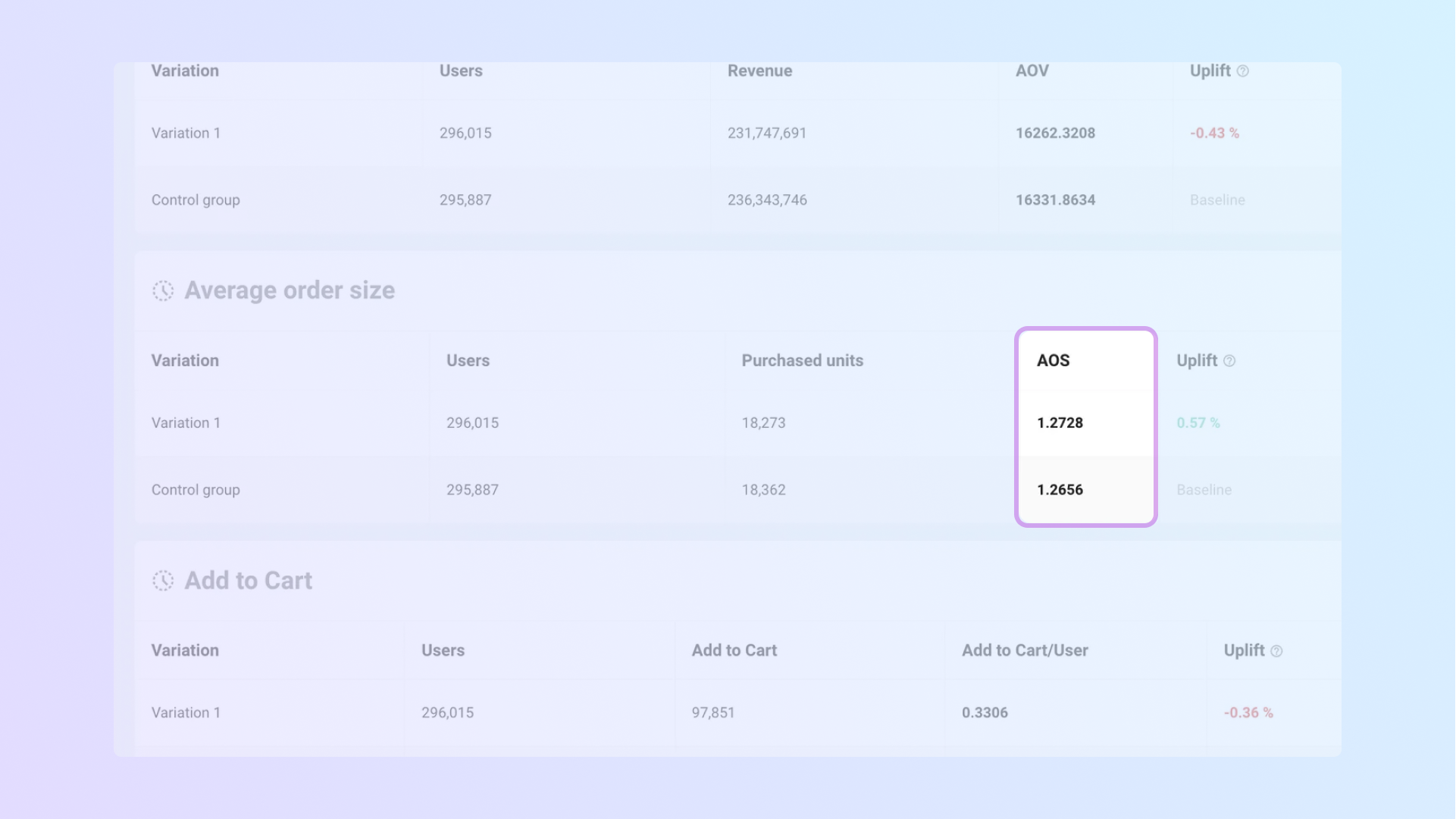 - Метрики по вариациям: Purchases, Revenue, Add to cart и др.