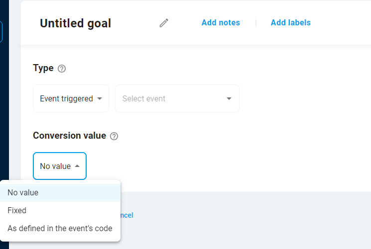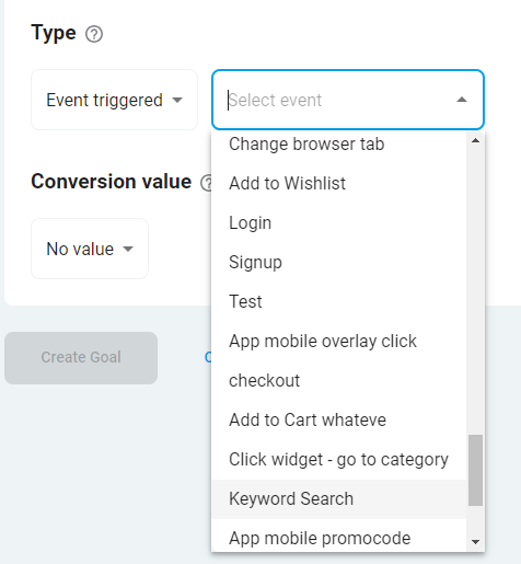 Если цель основывается на событии, вам будет предложено выбрать из выпадающего списка, о каком именно событии речь.