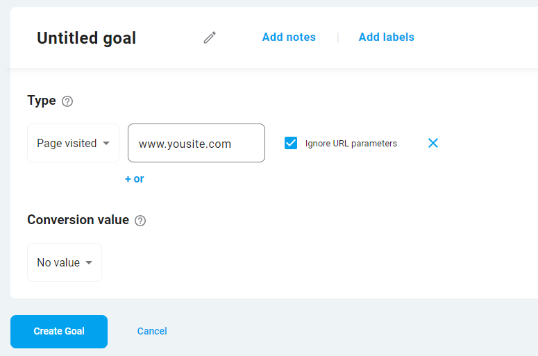 Если цель основывается на просмотре страницы, вам будет необходимо прописать адрес этой страницы или страниц, добавляя новые строки с помощью операнда OR. Активация чекбокса “Ignore URL parameters” позволит учесть все посещения страниц с указанным адресом вне зависимости от его URL параметров (например, utm-меток и других);
