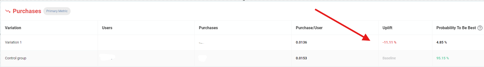 Посмотрите на значение в колонках Uplift. Положительное зеленое значение в тестовой вариации говорит о том, что кампания повышает заданную метрику (Пример 1). Отрицательное красное значение говорит о том, что кампания понижает заданную метрику (Пример 2)