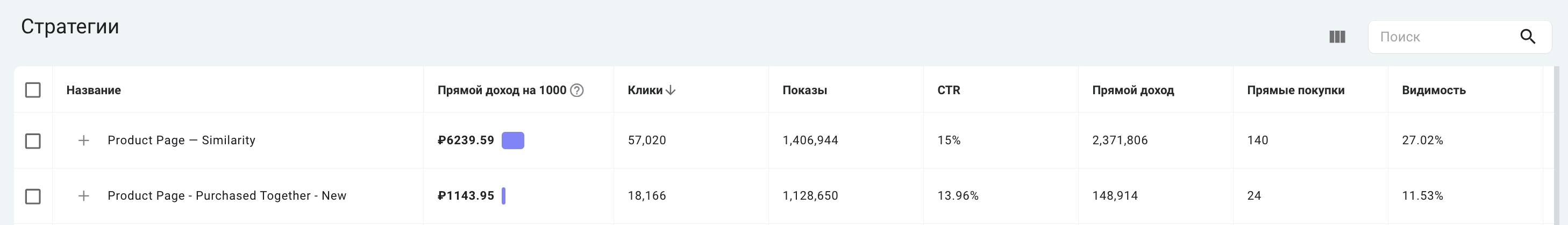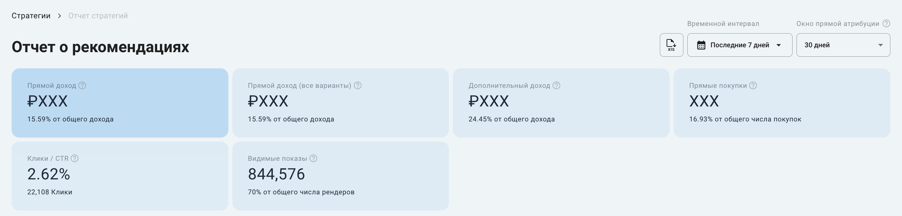 Блок показывает обобщенные показатели по всем стратегиям, которые участвовали в показах за выбранный период.
