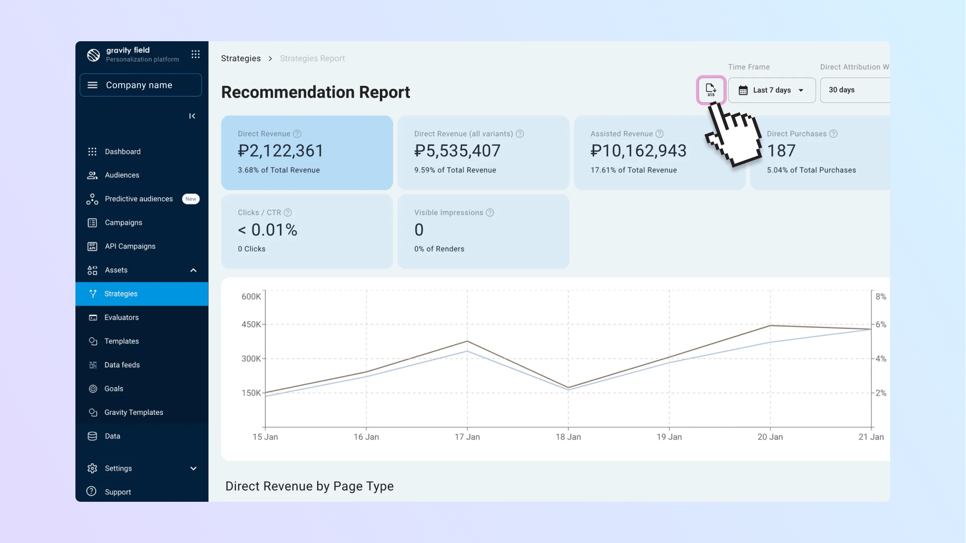 Эта статья поможет вам анализировать эффективность рекомендательных стратегий в платформе Gravity Field. Отчёт отражает работу самих стратегий — вне зависимости от того, участвуют ли они в A/B тестах.