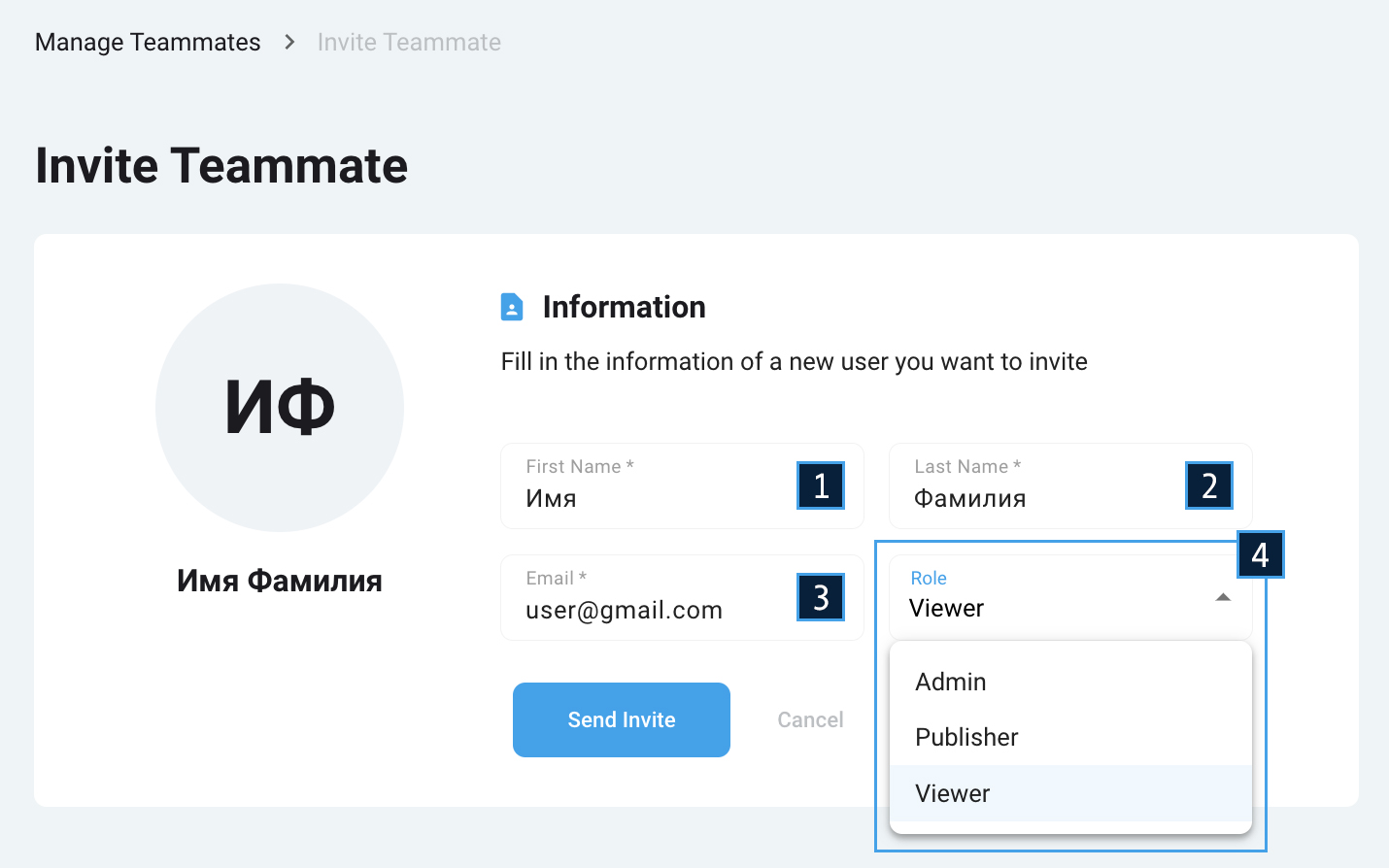 - Publisher — может создавать и публиковать кампании, видеть всю статистику. Не может добавлять новых пользователей.